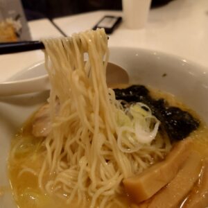 おそらく鶏系のスープに魚介の旨味ある白湯系のスープ、少し煮干し感が印象的なスープに遅めの麺の塩ラーメンですね。あとややオイリーでしょうか。個人的には清湯スープのひるがおさんラーメンのほうが好きかな?