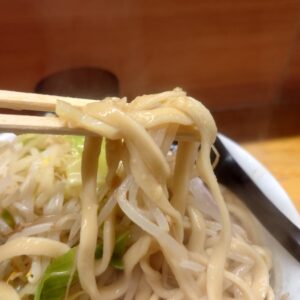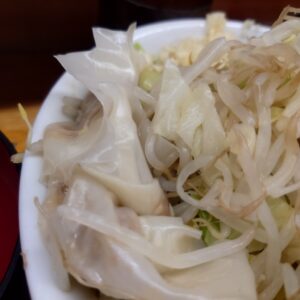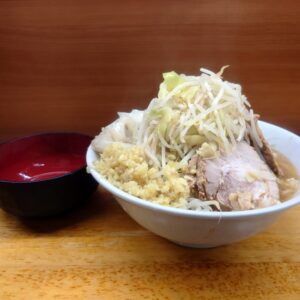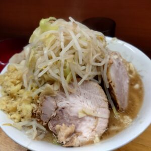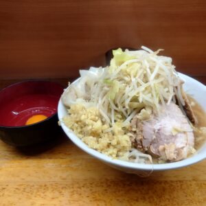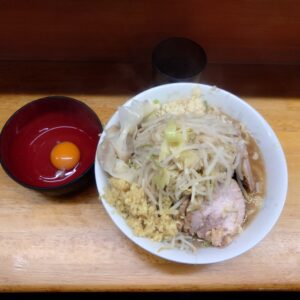 ラーメン二郎立川店「小ラーメン(ヤサイニンニク)+肉ワンタン+生卵+生姜」東京都立川市立川駅 立川二郎パワーチャージ麺