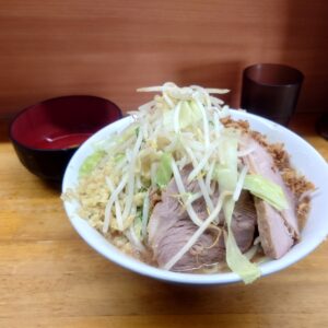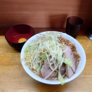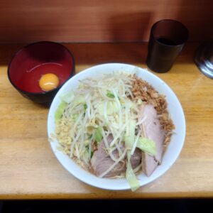小ラーメン麺280g豚2枚¥900+生卵¥50+ショウガ・フライドオニオントッピングを¥50を注文しました。