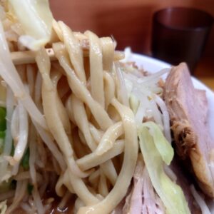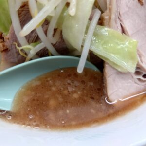 キャベツともやしが食べ進めていけば乳化かかっているスープ、醤油のスープです。麺は太めの麺ですがやわめに仕上がっており、豚系の美味しいスープと美味しい組み合わせ。二郎ラーメンですね!ラーメンにはチャーシューが2枚。厚めにカットのチャーシューは2種類の部位、旨味あるチャーシューで美味しいですね!