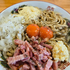 生卵をまぜてたまごかけめんにしていただきます。