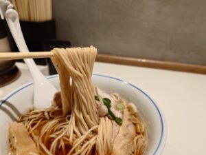 麺には国産小麦「美瑛産春よ恋」と「ハルユタカ」をブレンド。ストレート中細(22番)の長めの麺で、ツルツルとしっとりした食感ながらコシがあり、歯切れとモチモチ感を両立。スープに溶けにくく、絡みがよいのが特徴。