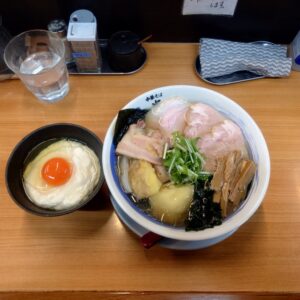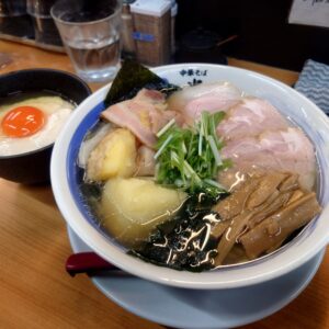 【あさりとベーコン出汁ラーメン+いたや貝ソース+若芽+生卵】
