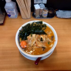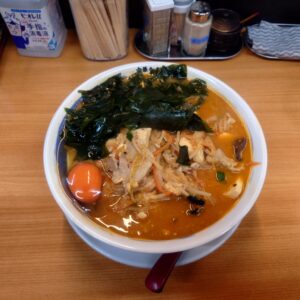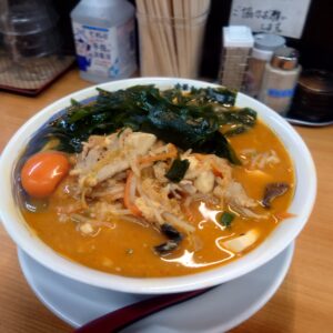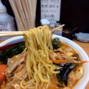 アツアルスープに味噌、野菜やなど具材盛りだくさんスープに太めの麺が絡まって美味しいラーメンですね。