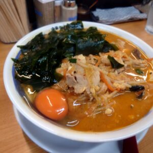 チゲ味噌ラーメン¥1,100+カード特典若芽+生卵¥100を注文しました。