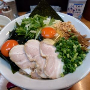 メンマ、海苔、みずな、フライドオニオン、わかめ、牡蠣ソース、生卵などですね。