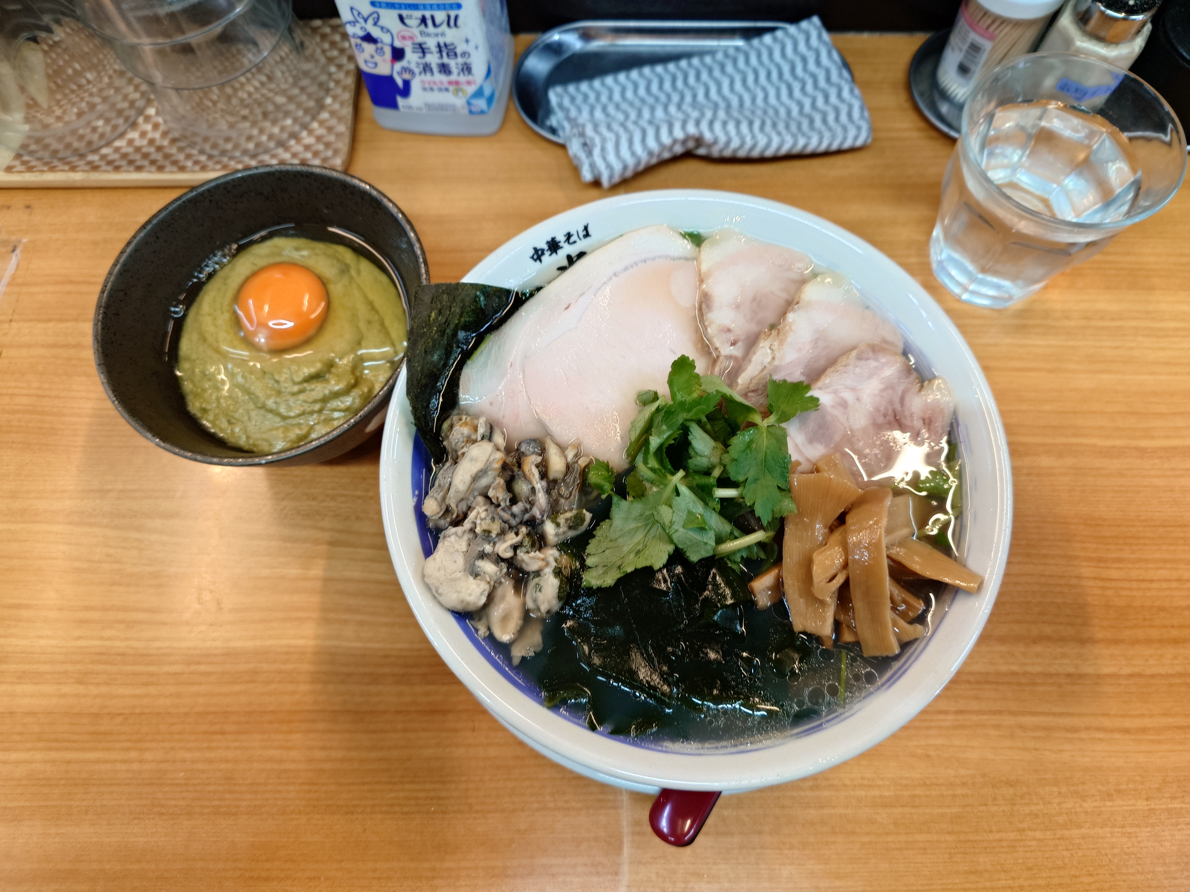 【牡蠣出汁塩ラーメン+牡蠣ソース+生卵+若芽】