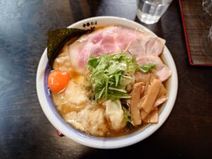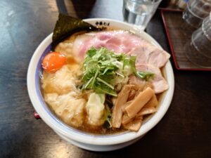 中華そば半ざわ【甘海老出汁の海老ワンタン麺塩+海老ワンタン増し+生卵+若芽】東京都西巣鴨駅 2026/4/25限定情報