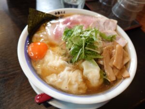 【甘海老出汁の海老ワンタン麺塩+海老ワンタン増し+生卵+若芽】