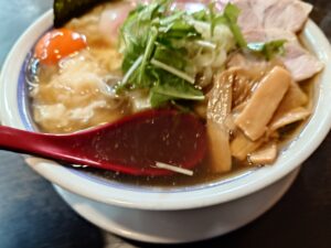 生卵、チャーシュー、メンマ、若芽、海苔、大きな海老ワンタンなどですね