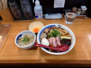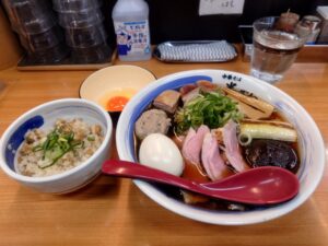 【鴨出汁ラーメン+帆立ご飯+生卵+若芽】