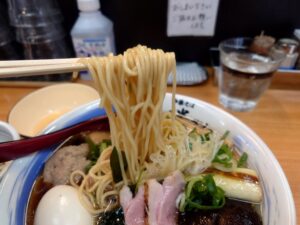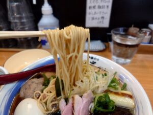 醤油スープ。鴨ガラ30Kgというスープはしっかりと鴨の旨味がふくよかに感じられるスープであり、鴨ラーメンとして美味しいラーメンですね。