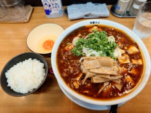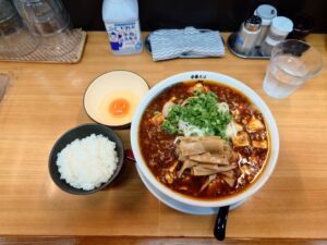 麻婆麺¥1,100+ライス小¥100+カード特典メンマ+生卵¥100を注文しました。