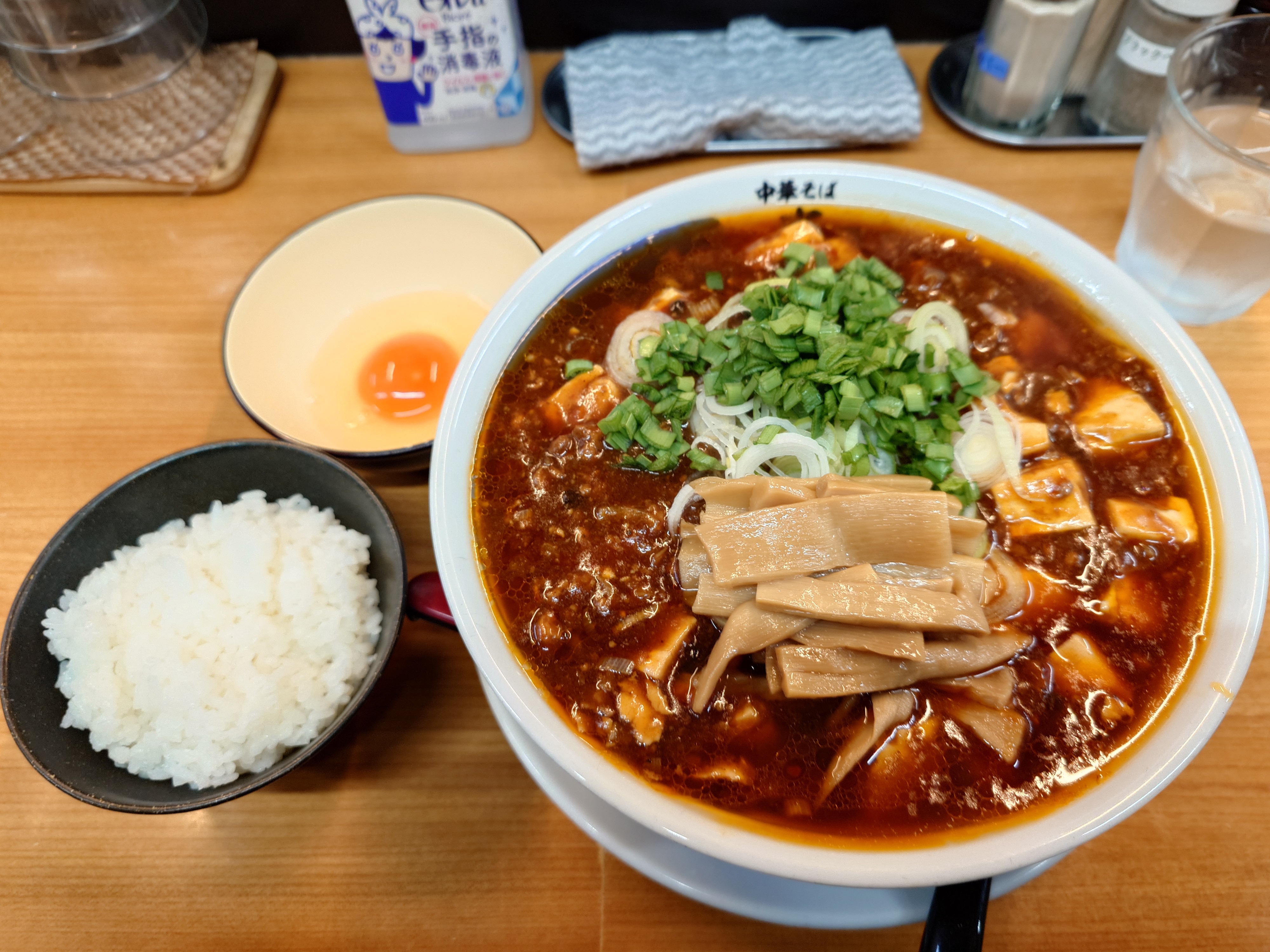 ねぎ、メンマ、麻婆餡。ライスに生卵などですね。