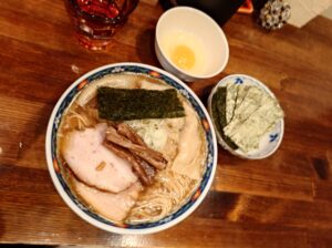チャーシュー、メンマ。目玉焼き、ワンタンと追加海苔追加生卵は別皿などですね。