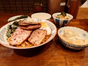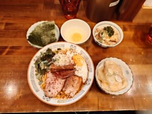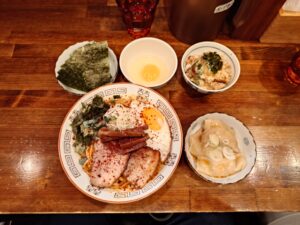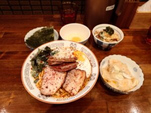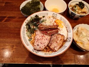 【雲吞付辛味まぜそば+海苔+生卵+天かすチャーシューごはん】