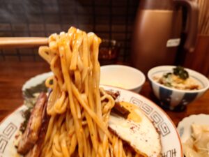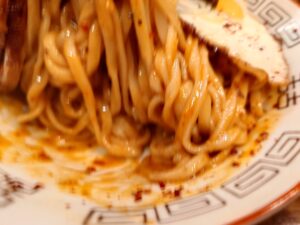 醤油系のタレをしっかり混ぜてくれている太い麺。この太い麺が想像外。少し太めの麺はもっちりと、もち姫使用でしょうか?辛味もありもちっろ麺が美味しいまぜそばですね!