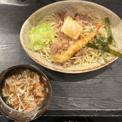 讃岐うどんのようなコシはありませんがもちっと気味の太めの美味しい麺ですね。スープは魚介などの醤油系、雰囲気はうどんですかね。