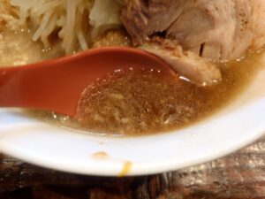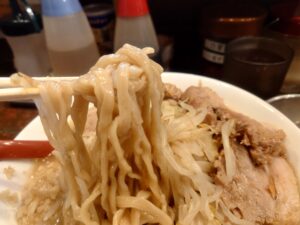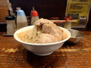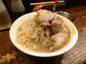 いわゆる二郎系ラーメンのお店です。豚系の醤油スープと太い麺と野菜とチャーシューとで食べごたえありですね!