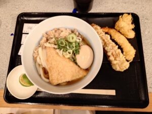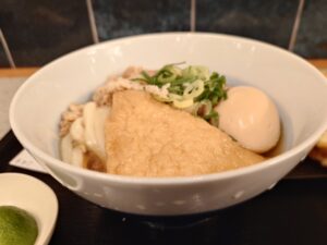 おあげ、味玉。肉、ねぎ。追加したちくわ天とり天大海老天、すだちは別皿ですね。