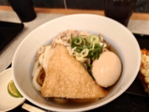 ぶっかけですがいわゆる醤油色のスープに比べると薄目の色合い。醤油テイストで出汁の旨味あるスープ。バランスよく美味しく旨味あるスープと太めのうどんが美味しいですね。