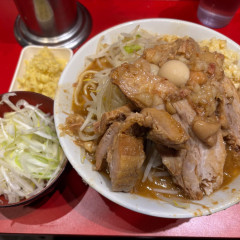 ヤサイアブラとニンニクと。豚のスープに極太麺の二郎系のラーメンです。
