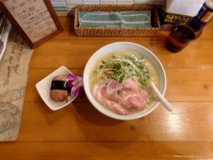 店内外はカフェのようなハワイアンテイストも感じるおしゃれな店構えながら、実力派の美味しいラーメンを提供されているお店さんであり毎週末は行列ができている池袋でも人気のお店ですね。ちゃぶ屋出身の方のお店でもあります。レギュラーメニューは鶏を使ったラーメンです。