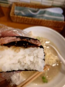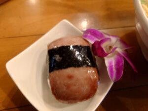 サイドメニューのスパムむすびはスパムとご飯の間に昆布や大葉などが入っていてこれまた美味しいご飯メニューです。