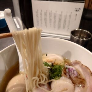 最初の提供時の熱いスープのときよりも個人的には少し冷えてきたときのほうがより旨味を感じるようなスープです、鶏の旨味がとことん抽出されているようなスープに細めの麺が美味しいラーメンですね。