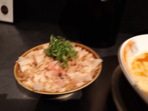 チャーシュー丼はあぶったチャーシューにかつおぶし、少しご飯を残してスープにドボン。美味しく完食です。