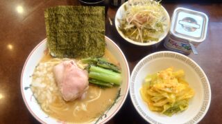 美味しいラーメン屋さん こいけのいえけい「豚骨醤油ラーメン並盛+味付キャベツ+小松菜+ハーフネギチャーご飯」東京都文京区巣鴨駅 小池にし乃キング製麺あいだや金龍伊乃瀬本郷苑あいだや2などの系列は小池流家系風ラーメン店