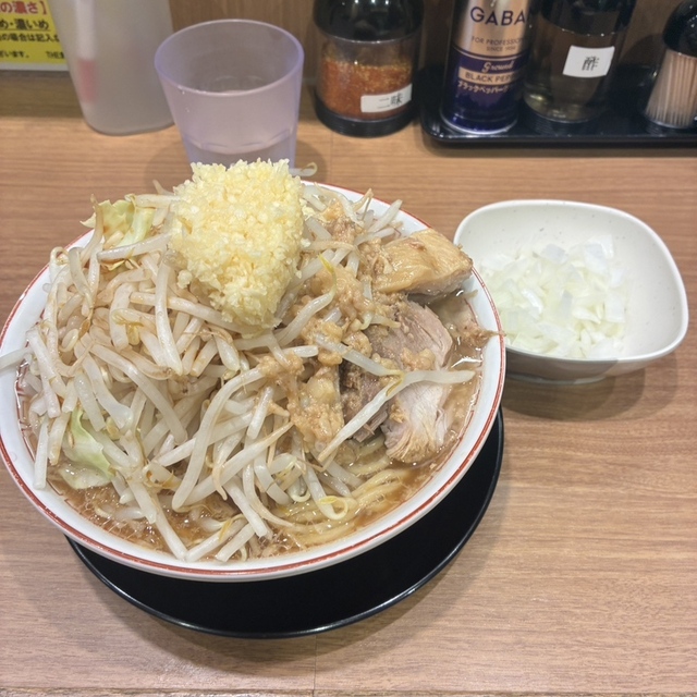 ヤサイ・ニンニク・アブラを増せます、今回はヤサイ少しマシで注文しました。